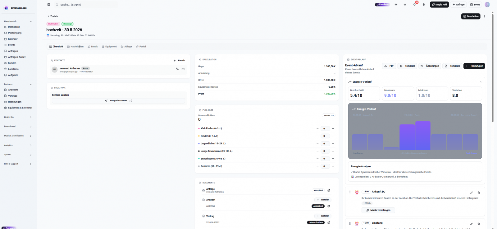 - Das moderne Eventportal für deine Kunden: Ersetze Zettelwirtschaft durch ein mobil optimiertes Portal. Fragebögen, Musikwünsche, Kontakte und der Ablaufplan – alles an einem zentralen Platz für dich und deine Kunden. Das Ergebnis: Ein per Klick exportierbarer Event-Fahrplan, mit dem du perfekt vorbereitet zum Gig fährst.